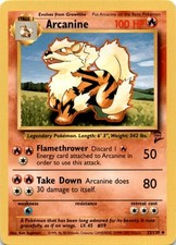 Arcanine is a Uncommon Pokémon card from the Base Set 2 Pokémon TCG set, released 1999, illustrated by Ken Sugimori. It sits at card number 33 in the Base Set 2 checklist, classified as a Fire-type Pokémon with 100 HP and the Stage 1 subtype.