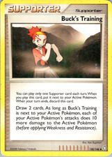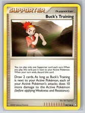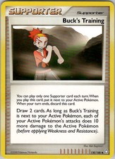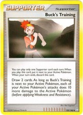 Buck's Training is a Uncommon Trainer card from the Legends Awakened Pokémon TCG set, released 2007, illustrated by Ken Sugimori. It sits at card number 130 in the Legends Awakened checklist and the Supporter subtype.