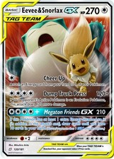 Eevee & Snorlax-GX is a Rare Holo GX Pokémon card from the Team Up Pokémon TCG set, released 2018, illustrated by Mitsuhiro Arita. It sits at card number 120 in the Team Up checklist, classified as a Colorless-type Pokémon with 270 HP and the Basic, TAG TEAM, GX subtypes.