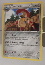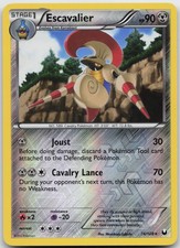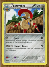Escavalier is a Rare Pokémon card from the Dark Explorers Pokémon TCG set, released 2011, illustrated by Masakazu Fukuda. It sits at card number 74 in the Dark Explorers checklist, classified as a Metal-type Pokémon with 90 HP and the Stage 1 subtype.