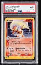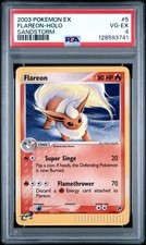 Flareon is a Rare Holo Pokémon card from the Sandstorm Pokémon TCG set, released 2003, illustrated by Midori Harada. It sits at card number 5 in the Sandstorm checklist, classified as a Fire-type Pokémon with 80 HP and the Stage 1 subtype.