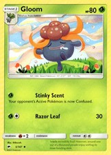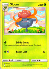 Gloom is a Uncommon Pokémon card from the Burning Shadows Pokémon TCG set, released 2017, illustrated by Shibuzoh.. It sits at card number 5 in the Burning Shadows checklist, classified as a Grass-type Pokémon with 80 HP and the Stage 1 subtype.
