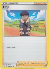 Hop is a Uncommon Trainer card from the Sword & Shield Pokémon TCG set, released 2020, illustrated by Ken Sugimori. It sits at card number 165 in the Sword & Shield checklist and the Supporter subtype.