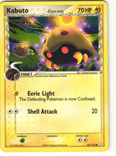 Kabuto δ is a Common Pokémon card from the Holon Phantoms Pokémon TCG set, released 2003, illustrated by Hajime Kusajima. It sits at card number 67 in the Holon Phantoms checklist, classified as a Lightning-type Pokémon with 70 HP and the Stage 1 subtype.