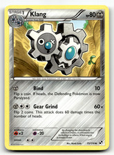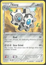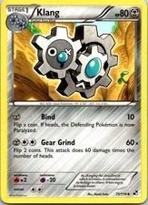 Klang is a Uncommon Pokémon card from the Black & White Pokémon TCG set, released 2011, illustrated by Naoki Saito. It sits at card number 75 in the Black & White checklist, classified as a Metal-type Pokémon with 80 HP and the Stage 1 subtype.