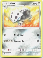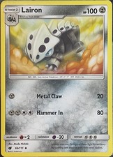 Lairon is a Uncommon Pokémon card from the Crimson Invasion Pokémon TCG set, released 2017, illustrated by Atsuko Nishida. It sits at card number 66 in the Crimson Invasion checklist, classified as a Metal-type Pokémon with 100 HP and the Stage 1 subtype.
