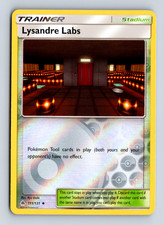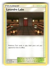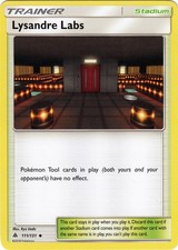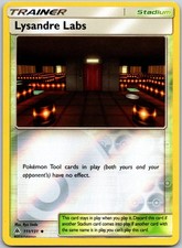 Lysandre Labs is a Uncommon Trainer card from the Forbidden Light Pokémon TCG set, released 2018, illustrated by Ryo Ueda. It sits at card number 111 in the Forbidden Light checklist and the Stadium subtype.