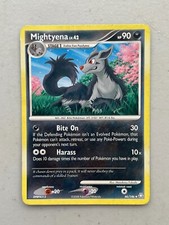 Mightyena is a Uncommon Pokémon card from the Legends Awakened Pokémon TCG set, released 2007, illustrated by Masakazu Fukuda. It sits at card number 66 in the Legends Awakened checklist, classified as a Darkness-type Pokémon with 90 HP and the Stage 1 subtype.