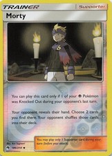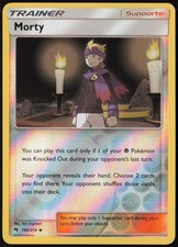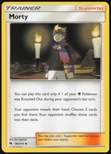 Morty is a Uncommon Trainer card from the Lost Thunder Pokémon TCG set, released 2018, illustrated by Ken Sugimori. It sits at card number 186 in the Lost Thunder checklist and the Supporter subtype.
