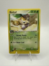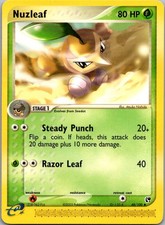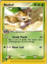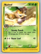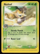 Nuzleaf is a Uncommon Pokémon card from the Sandstorm Pokémon TCG set, released 2003, illustrated by Atsuko Nishida. It sits at card number 48 in the Sandstorm checklist, classified as a Grass-type Pokémon with 80 HP and the Stage 1 subtype.