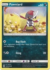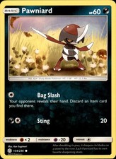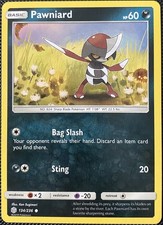 Pawniard is a Common Pokémon card from the Cosmic Eclipse Pokémon TCG set, released 2019, illustrated by Ken Sugimori. It sits at card number 134 in the Cosmic Eclipse checklist, classified as a Darkness-type Pokémon with 60 HP and the Basic subtype.