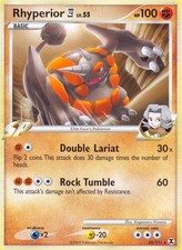 Rhyperior E4 is a Rare Pokémon card from the Rising Rivals Pokémon TCG set, released 2009, illustrated by Kagemaru Himeno. It sits at card number 32 in the Rising Rivals checklist, classified as a Fighting-type Pokémon with 100 HP and the Basic, SP subtypes.