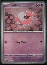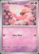 Spritzee is a Common Pokémon card from the Prismatic Evolutions Pokémon TCG set, released 2025. It sits at card number 38 in the Prismatic Evolutions checklist, classified as a Psychic-type Pokémon with 60 HP and the Basic subtype.