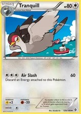 Tranquill is a Uncommon Pokémon card from the Boundaries Crossed Pokémon TCG set, released 2011, illustrated by Kanako Eo. It sits at card number 124 in the Boundaries Crossed checklist, classified as a Colorless-type Pokémon with 80 HP and the Stage 1 subtype.