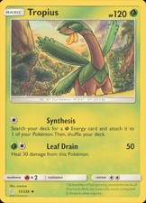 Tropius is a Uncommon Pokémon card from the Cosmic Eclipse Pokémon TCG set, released 2019, illustrated by sowsow. It sits at card number 12 in the Cosmic Eclipse checklist, classified as a Grass-type Pokémon with 120 HP and the Basic subtype.