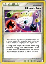 Ultimate Zone is a Uncommon Trainer card from the Arceus Pokémon TCG set, released 2009, illustrated by Yusuke Ishikawa. It sits at card number 91 in the Arceus checklist and the Stadium subtype.