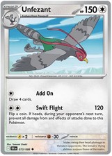 Unfezant is a Uncommon Pokémon card from the Black Bolt Pokémon TCG set, illustrated by Tomomi Ozaki. It sits at card number 73 in the Black Bolt checklist, classified as a Colorless-type Pokémon with 150 HP and the Stage 2 subtype.