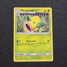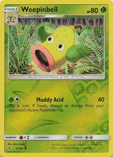 Weepinbell is a Uncommon Pokémon card from the Guardians Rising Pokémon TCG set, released 2017, illustrated by Mina Nakai. It sits at card number 2 in the Guardians Rising checklist, classified as a Grass-type Pokémon with 80 HP and the Stage 1 subtype.