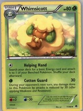 Whimsicott is a Uncommon Pokémon card from the Emerging Powers Pokémon TCG set, released 2011, illustrated by sui. It sits at card number 11 in the Emerging Powers checklist, classified as a Grass-type Pokémon with 80 HP and the Stage 1 subtype.